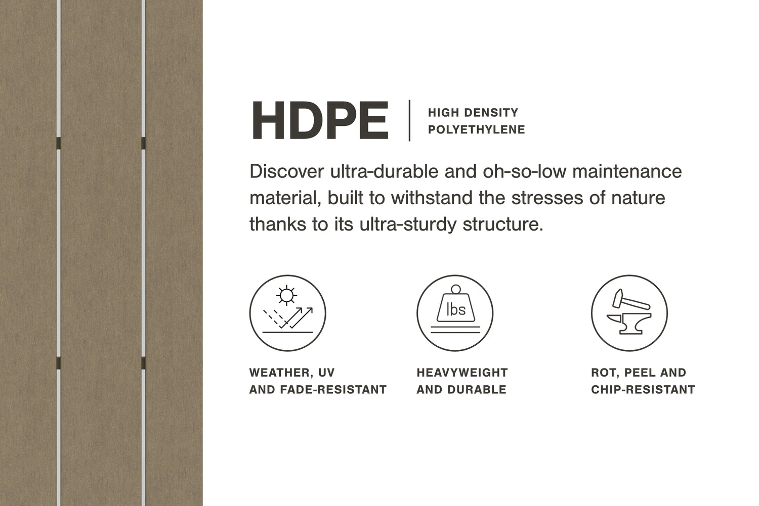 - Made of MEGA-TUFF® HDPE (a high-density polyethylene), which gives the wood look you love and the weather resistance you crave