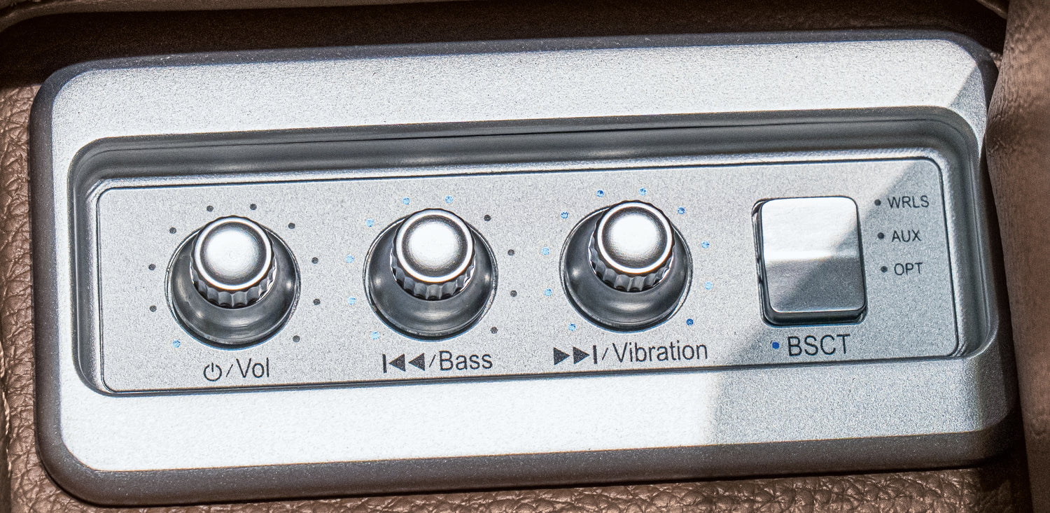 - Armrests with flip-top storage; hidden Thunder control panel with adjustable volume, bass and vibration knobs